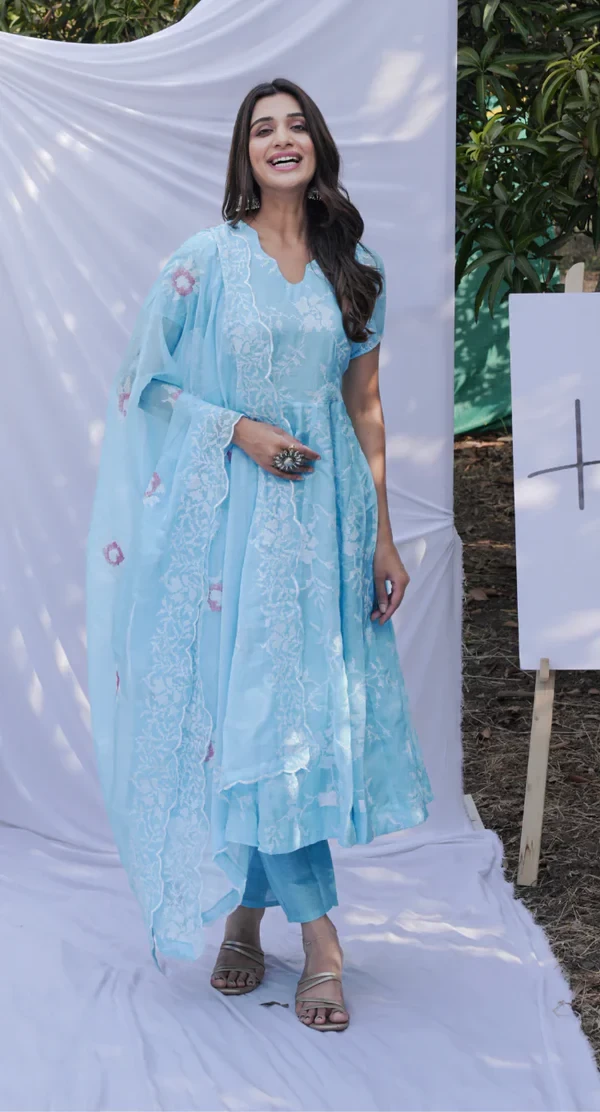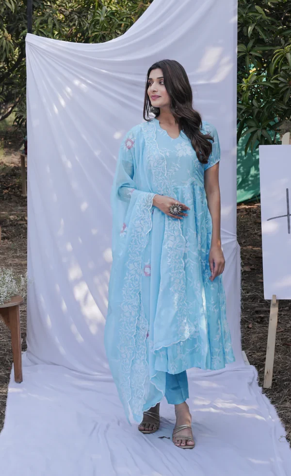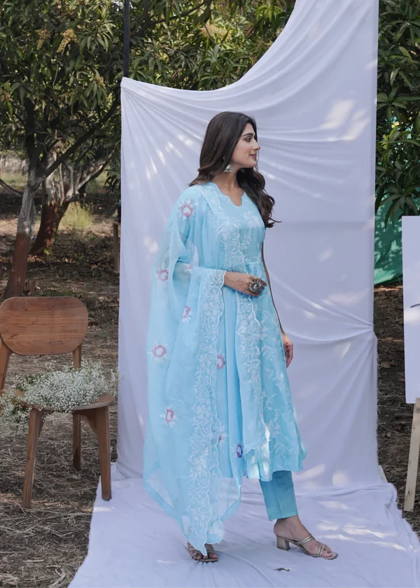 Firozi Anarkali Ethnic Motifs Embroidered Thread Kurta & Trousers With Dupatta |