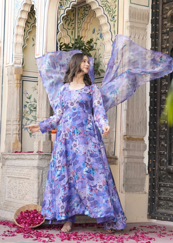 Anarkali Ethnic Floral Print Kurta & Trousers With Dupatta || BL0S5Q