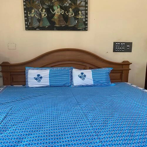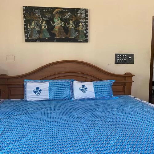 The set usually includes a generously sized double bed sheet that fits most standard double beds and two matching pillow covers, each adorned with complementary designs. The fabric is breathable and comfortable, ensuring a good night's sleep while adding a touch of ethnic charm to the room. The prints are often block-printed or screen-printed, showcasing the craftsmanship of artisans from Rajasthan. This bed sheet set is perfect for those looking to add a bohemian or traditional touch to their home decor.