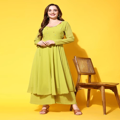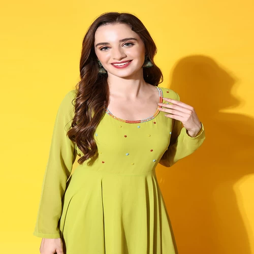 Women Lime Green Georgette Hand Embroidery Anarkali Kurta || OFEPCK