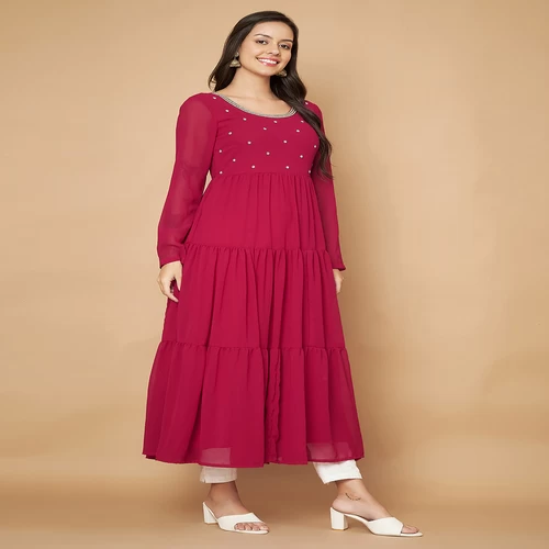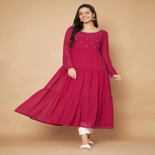 Women Pink Georgette Embroidery Tiered Anarkali Kurta || 5M85VD