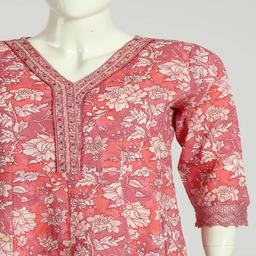 Beautiful Floral Print on Kurti. Hand work on Neck. Lace Work on Sleeves and Full Daaman