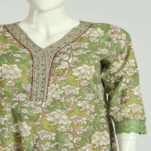 Beautiful Floral Print on Kurti. Hand work on Neck. Lace Work on Sleeves and Full Daaman