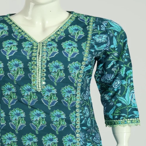 Beautiful Flower Print on Kurti. Lace Work on Neck, Sleeves, Sides and Daman and Pants