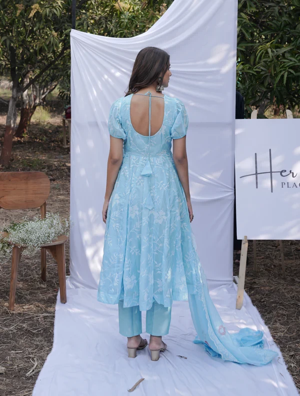Firozi Anarkali Ethnic Motifs Embroidered Thread Kurta & Trousers With Dupatta |