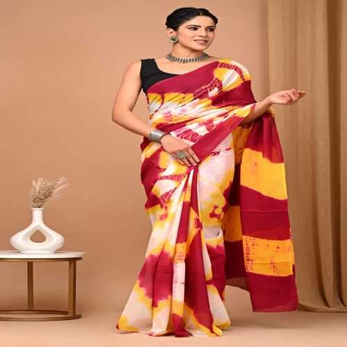 • FABRIC : Cotton Mulmul Saree with Cotton Mulmul fabric Blouse pc || Work: Shibori Tie Dye Print,Printed,Block print,Ajrak print, Traditional Ethnic Look.
