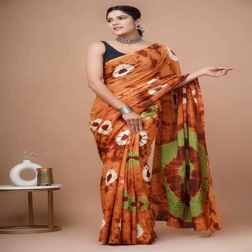 • FABRIC : Cotton Mulmul Saree with Cotton Mulmul fabric Blouse pc || Work: Shibori Tie Dye Print,Printed,Block print,Ajrak print, Traditional Ethnic Look.