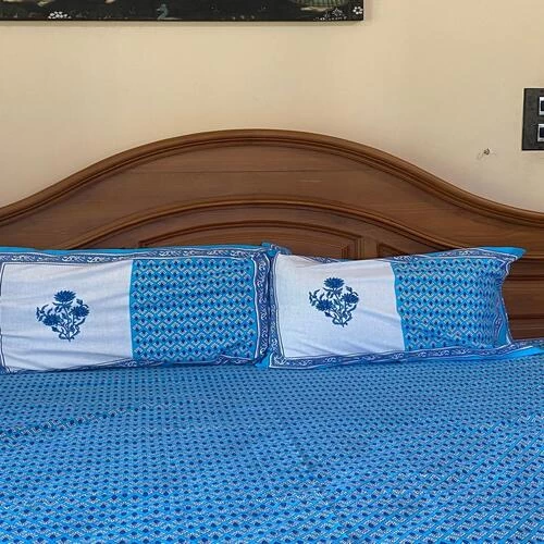 A Rajasthani printed double bed sheet set with two pillows is a vibrant and stylish addition to any bedroom, reflecting the rich cultural heritage of Rajasthan. Typically made from soft cotton or a cotton-blend fabric, the bed sheet features intricate, traditional prints inspired by Rajasthan's folk art, such as paisleys, mandalas, floral motifs, or geometric patterns. These prints are often in bold, eye-catching colors like rich reds, oranges, blues, and yellows, creating a lively and exotic feel.
