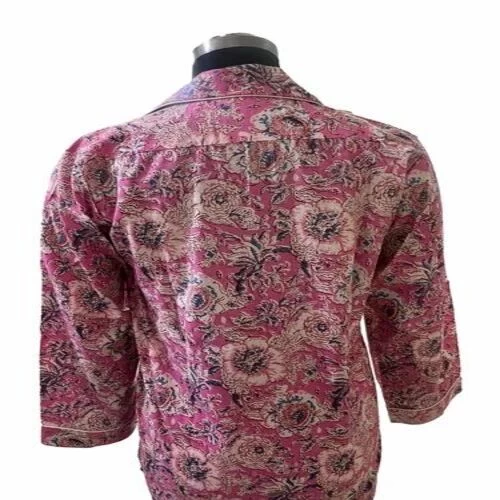 printed shirt, has shirt neck, three quarter sleeves, button placket closure and regular waist hem