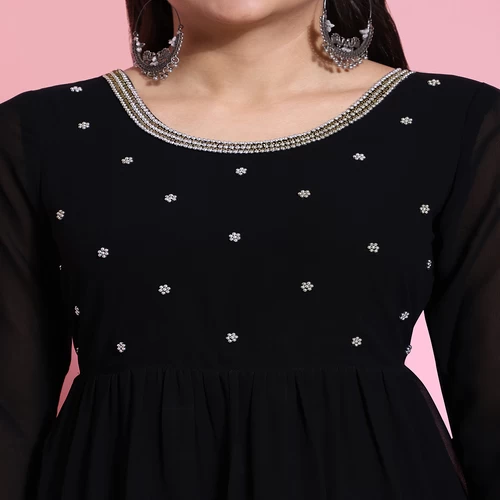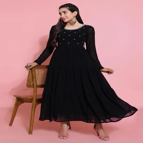 Women Black Georgette Embroidery Tiered Anarkali Kurta || VLP54P